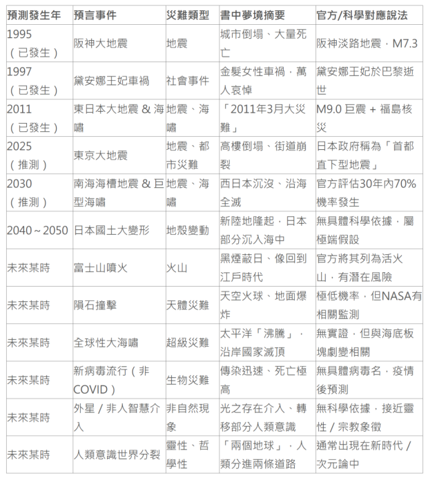 其中最著名的是“2011年3月11日,東日本大地震”這一則預言,就是導致福島核電站事故的那一次,經媒體報道後,引發巨大爭議。