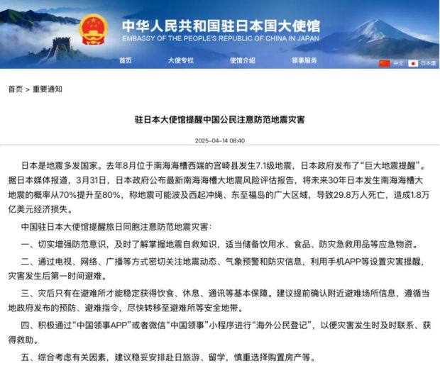 4月14日,中國駐日大使館突然發佈“重要通知”,提醒赴日人員注意防範地震災害。