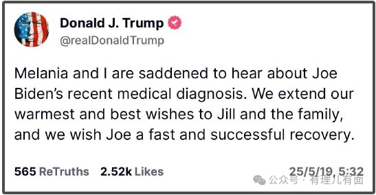 當天,特朗普在其社交媒體平台“真實社交”上發文,稱自己和妻子對拜登的病情深感悲痛,並向拜登及其家人致以最温暖和最美好的祝願,希望他早日康復。