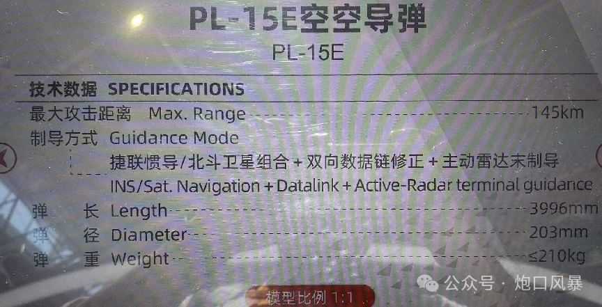 據巴基斯坦《國際新聞報》報道,印巴“5.7”空戰當晚,巴基斯坦空軍的殲-10CE戰鬥機從98海里(181.5千米)外發射了霹靂-15E空空導彈,遠程擊落了印軍陣風戰鬥機。説明中國出口給巴基斯坦的霹靂-15空空導彈射程很可能像珠海航展的展板上標註的145公里。
