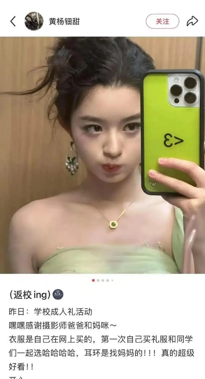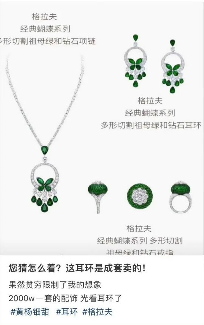 這一路,她走得很順,於是在成人禮上,她穿着漂亮的禮服,配上了好看的首飾,喜氣洋洋地曬了出來。很快被扒出這是格拉芙2013年推出的一套高珠行頭中的一副耳環。格拉芙是頂級奢侈珠寶商,更是英國王室珠寶和鐘錶的指定供應商。這副耳環在2013年的市價是230萬,而這一套行頭是不能拆開賣的,總價2000萬。順便,網友也在黃楊母親多年前的首飾中發現了這套行頭中的一枚戒指。