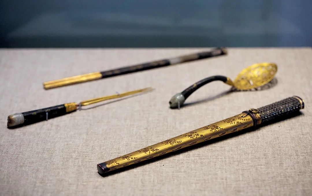 其中的金嵌紫檀柄玉頂果叉上裝飾“壽”字,推測是為某位帝、後生辰時特製