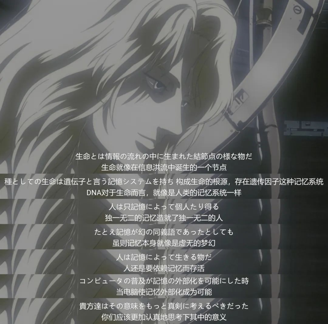 而士郎正宗則藉此表達一種Cyber-punk題材中的普遍主題:如果精神能夠被人工智能所模擬,肉體能夠被強有力的機器所替代,甚至於靈魂也從無序的信息海洋之中湧現,那麼我們便無法確證自身獨一無二的存在和價值。
