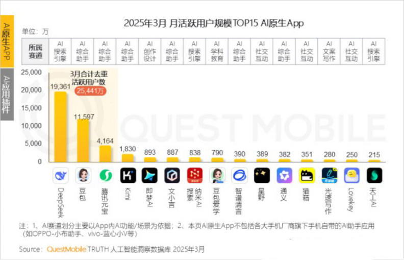 **不過半年,Kimi在月活榜上已經從第二滑向了第四。**根據QuestMobile數據,DeepSeek,字節豆包,騰訊元寶分別以1.94億、1.16億和4164萬的月活用户數霸榜前三,Kimi以1820萬的月活數位居第四(截止2025年3年)。
