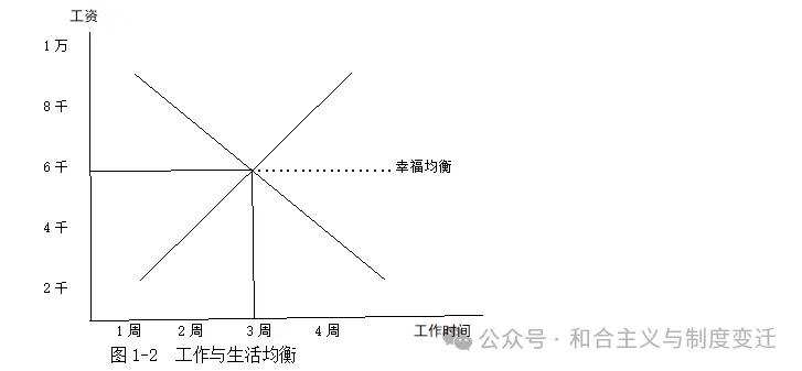 上圖反映了工作時間、工資變動、幸福感三個變量的相互關係:隨着工作時間增加,幸福感邊際遞減;隨着消費娛樂增加,機會成本邊際遞增;當達到均衡點時,成本與收益達到均衡,這就是幸福最大化的均衡。
