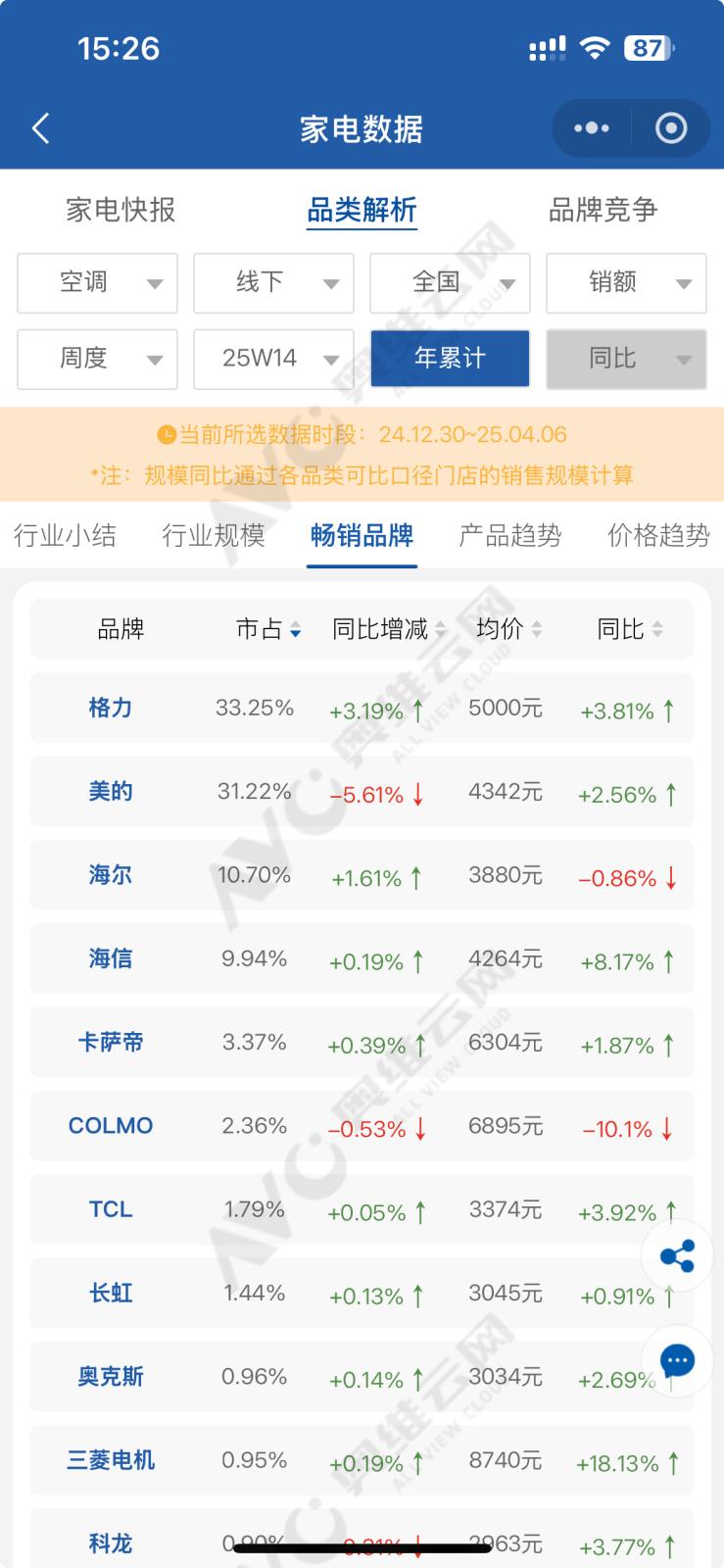同樣將時間段選在從以去年年末到截止到今年4月6日,數據顯示,在平均價格同比上升3.81%的情形下, 格力市佔率同比上升3.19%。美的平均價格同樣有所上升,但市佔率下滑了5.61%。前六名中,海爾、海信、卡薩帝(海爾)市佔率分別上升了1.61%、0.19%、0.39%。