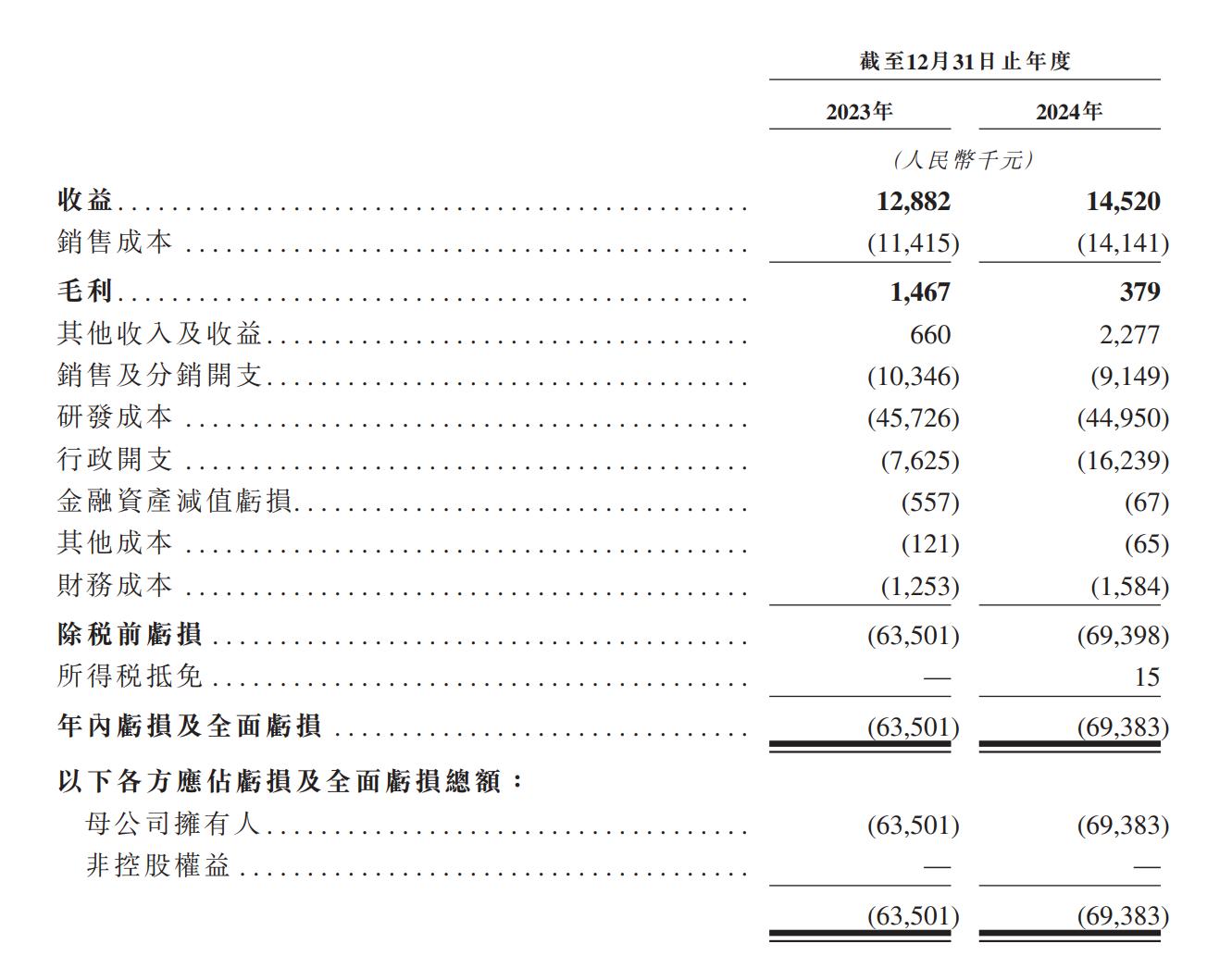 從招股書披露的財務數據來看,東方妍美近兩年來的營收極為微薄。2023年,東方妍美實現收益1288.2萬元;到了2024年,收益雖有所增長,但也僅達到1452萬元,這樣的營收規模在競爭激烈的醫療健康市場中顯得微不足道。與之形成鮮明對比的是,東方妍美的虧損情況卻相當嚴重。2023年,其母公司擁有人應占虧損及全面虧損總額為6350.1萬元;2024年,這一數字進一步攀升至6938.3萬元,兩年累計虧損超過1.3億元。