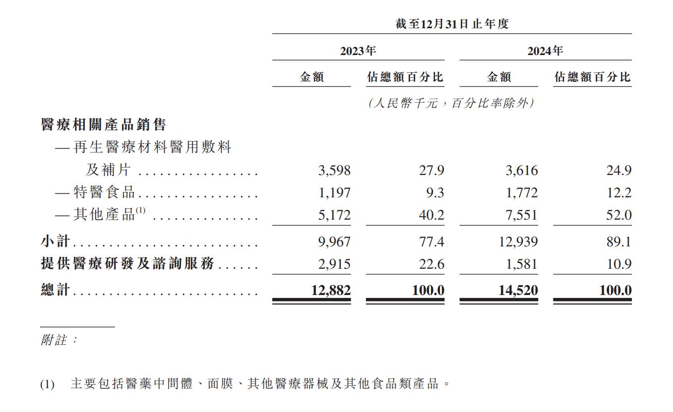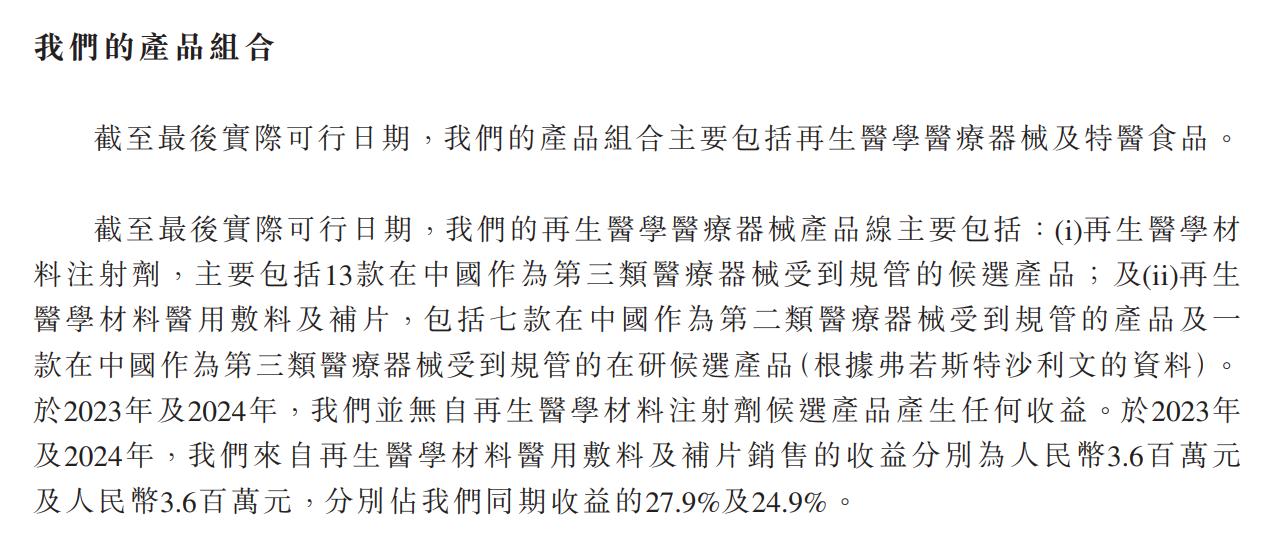 在東方妍美已實現收益的產品中,再生醫學材料醫用敷料及補片銷售的收益2023年及2024年分別為360萬元及360萬元,佔東方妍美同期收益的比例並不高,分別為27.9%及24.9%。