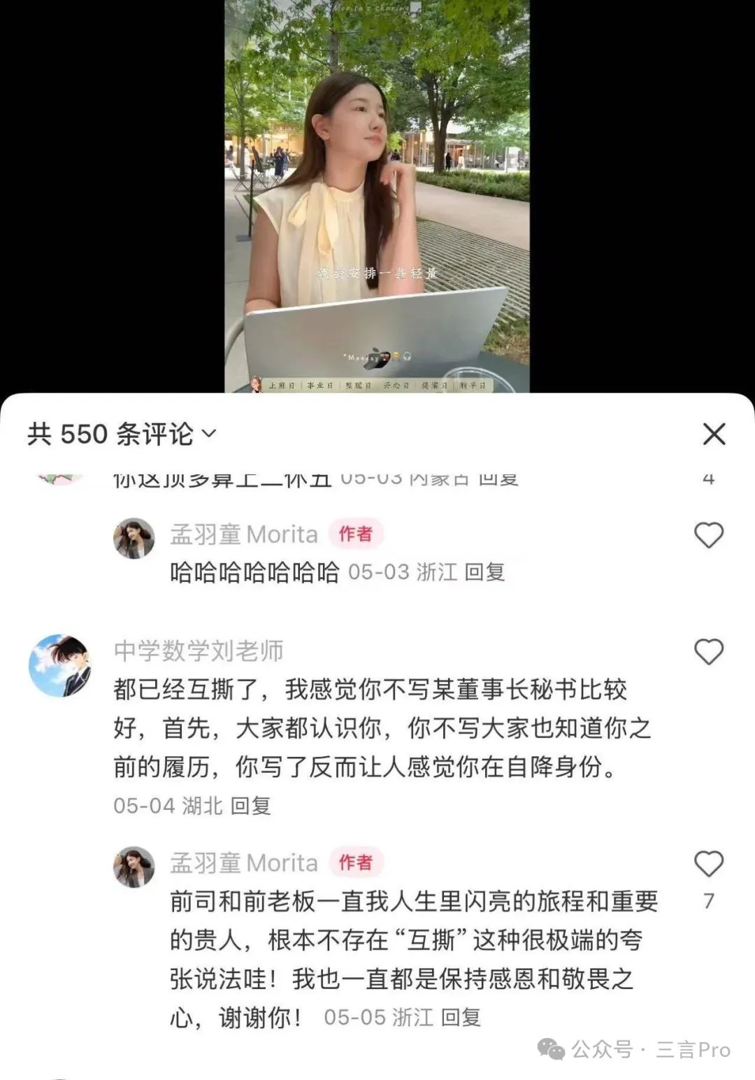 近日,有網友在其賬號下評論稱:“都已經互撕了,我感覺你不寫某董事長秘書比較好,首先,大家都認識你,你不寫大家也知道你之前的履歷,你寫了反而讓人感覺你在自降身份。”