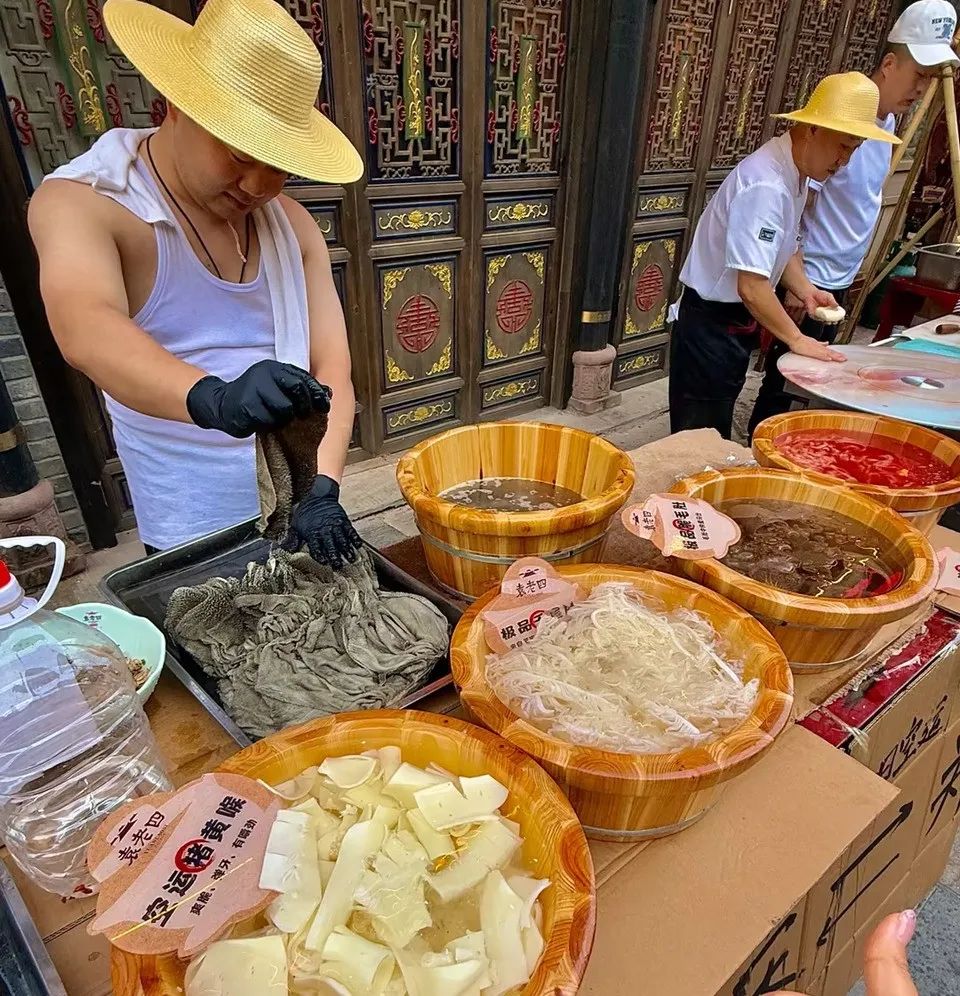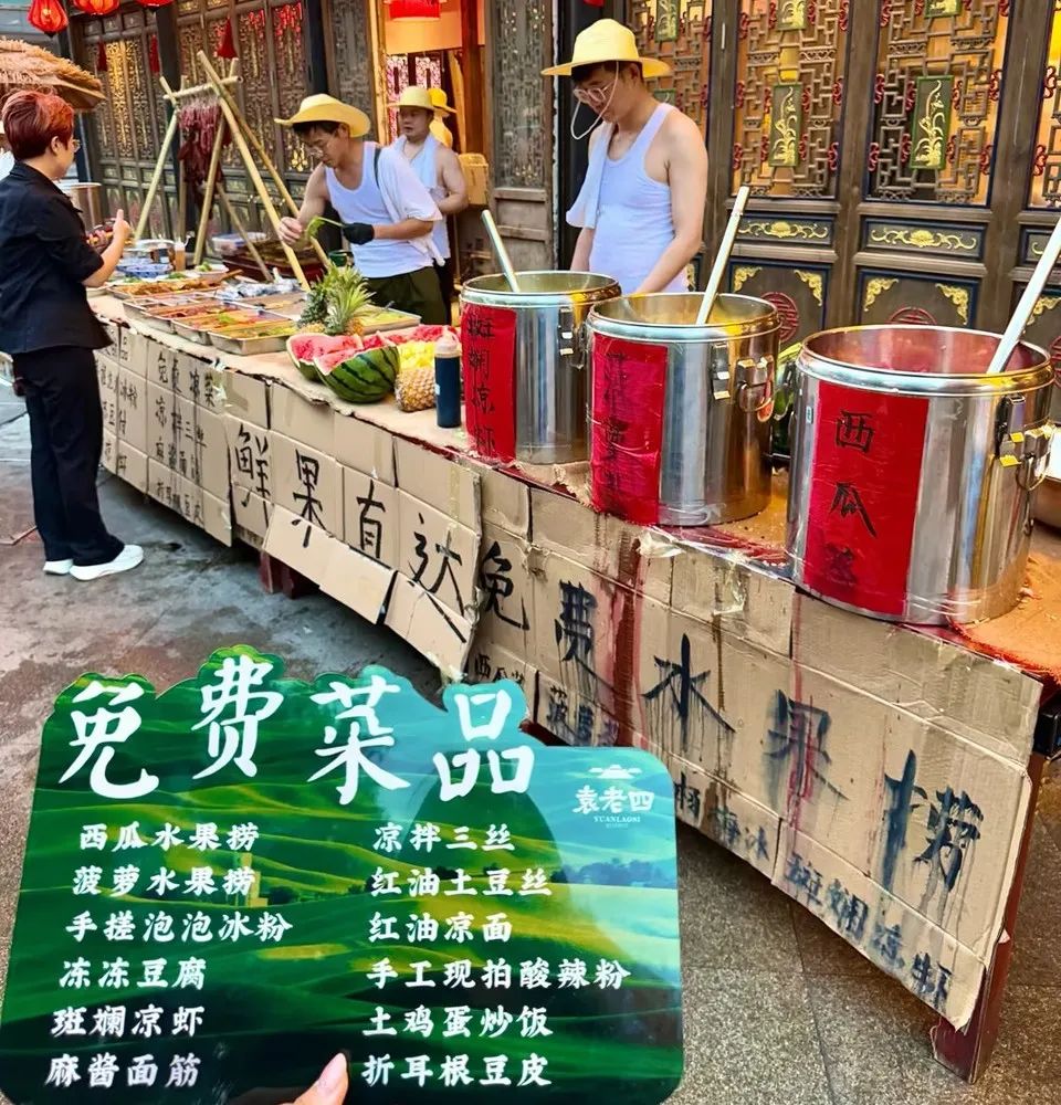 比如,最近袁老四老火鍋做了一場“秀”,在店外大擺免費式體驗,從各色水果撈、手搓冰粉、斑斕涼蝦,再到酸辣粉、鐵板炒飯等,10多種冰品小吃當開胃前菜,目的還是引客進店。