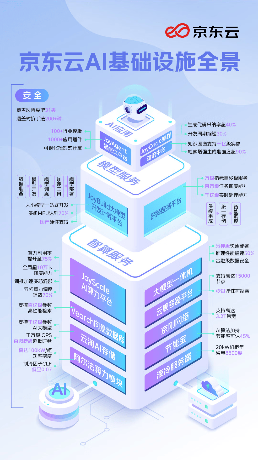 正因如此,AI基礎設施的標準化與平台化,成為2025年後AI產業演進的新焦點。以京東云為例,其圍繞大模型的規模化應用,搭建起了從算力平台、開發平台到推理系統的全鏈路基礎設施。