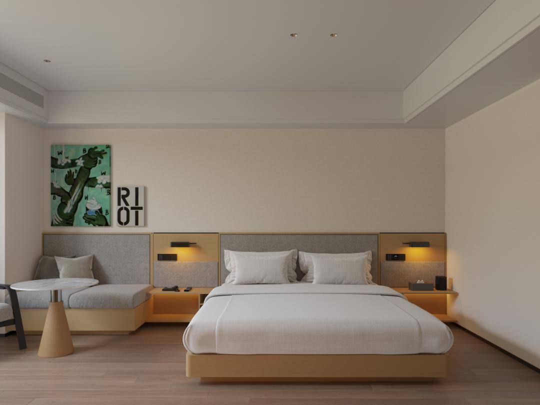 “用傳統酒店的方式把電競酒店重新做一遍。”賽博外星人與許多人印象中的電競酒店不同,沒有“炫酷”的燈光效果,色調和佈局更像全季或者亞朵等連鎖商務酒店,電競、動漫等元素被剋制地點綴其中。