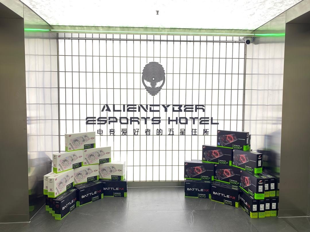這是一款今年1月底剛發售、售價高達3萬/塊仍供不應求的昂貴電腦配件,隨着它們被裝進電腦,賽博外星人成為全國最早一批全部電腦都是50系顯卡的電競酒店之一。