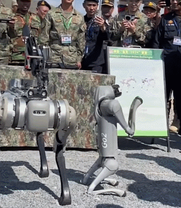 ▲柬埔寨軍官和機器狗握手
