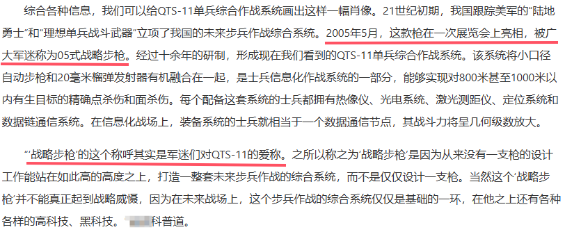 由於系統複雜,研製難度大,單兵綜合作戰系統的研製和改進持續了數年甚至數十年。而且直到今天,國內也沒有完全公開這類武器的研究細節,“QTS11”很可能只是研究過程中的一個編號而已。至少據軍武菌所知,有一些單兵綜合作戰系統槍身上的銘文就並非QTS11,而是QTS12。