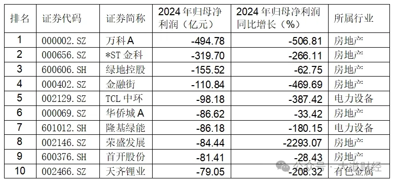 表: 2024年上市公司虧損規模前十