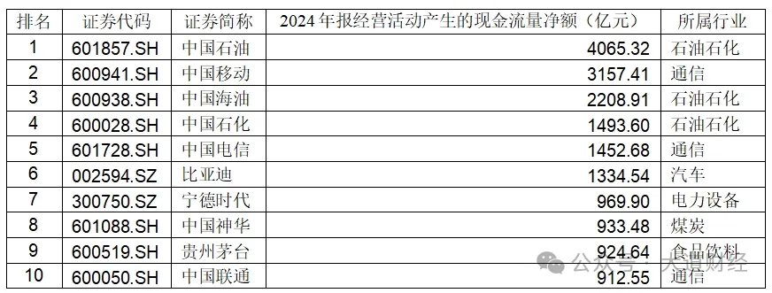 表:2024年上市公司現金流規模前十(剔除金融行業後)