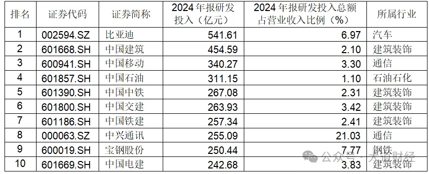 表:2024年上市公司研發投入前十