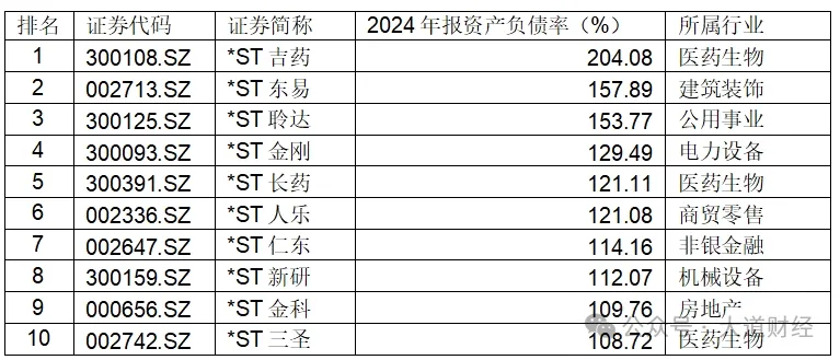 與現金流充沛的企業相對,一些上市公司出現資不抵債的現象,其中*ST吉藥的2024年的資產負債率為204.08%,是全A負債率最高的上市公司。