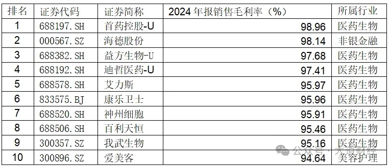 表:2024年上市公司毛利率前十