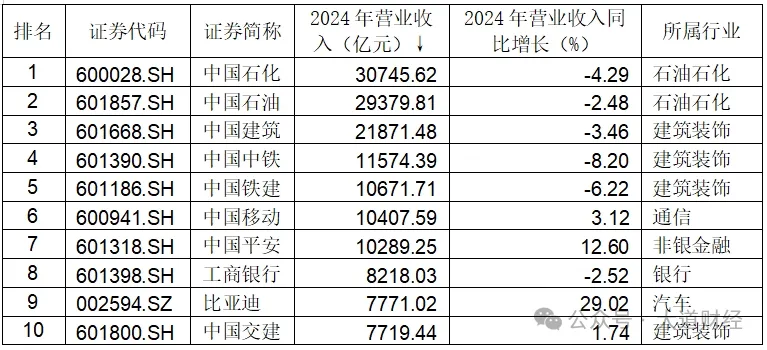 中國建築、中國中鐵、中國鐵建三家建築裝飾公司則直追其後。值得一提的是,在2024年上市公司營收規模前十榜單中,“中字頭”企業佔據了八席,唯二的例外是工商銀行和比亞迪,其分別實現營業收入8218.03億元和7771.02億元,且後者更是實現了近30%的同比增長。