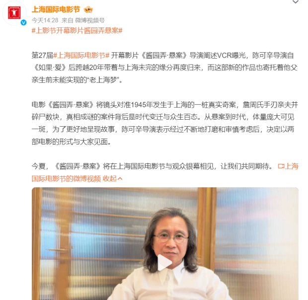 導演陳可辛宣佈《醬園弄》將分為兩部電影上映,《醬園弄·懸案》將作為第27屆上海國際電影節開幕片率先登場。