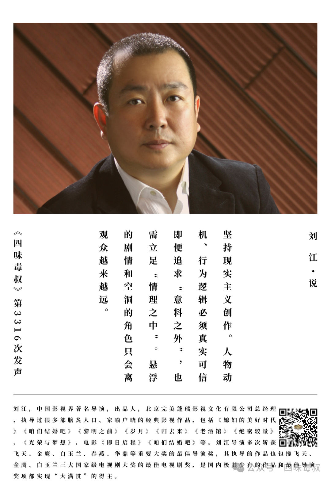 譚飛:歡迎《絕密較量》的導演劉江做客《四味毒叔》。