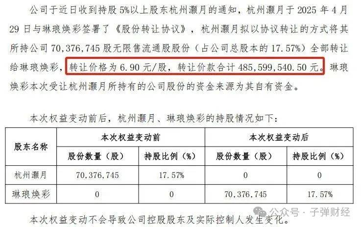 2025年4月29日,杭州灝月與琳琅煥彩簽訂《股份轉讓協議》,約定杭州灝月將其持有的麗人麗妝7037.67萬股(佔麗人麗妝總股本的17.57%)無限售條件流通股轉讓給琳琅煥彩。每股轉讓價格為6.90元,琳琅煥彩應向杭州灝月支付的股份轉讓價款總額為4.86億元。