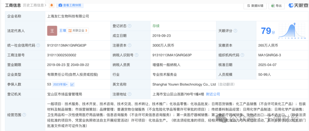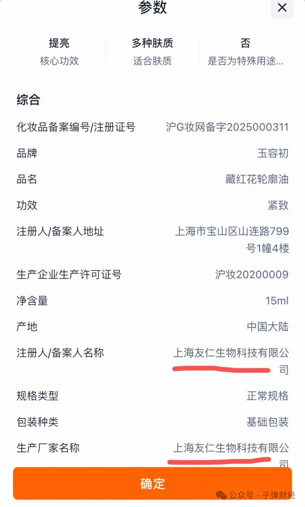 據玉容初旗艦店,品牌產品的生產方/備案方為上海友仁生物科技有限公司。天眼查顯示,該公司成立於2019年,業務涉及化妝品批發、OEM/ODM。