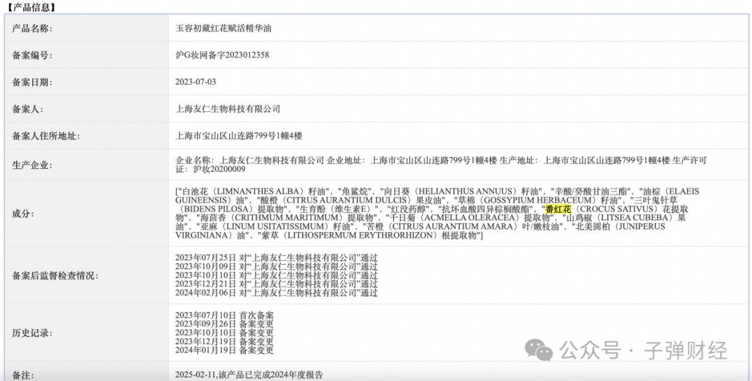 從成分上看,雖然玉容初品牌高度綁定藏紅花概念,但幾款核心產品,如藏紅花賦活精華油、藏紅花膠肽緊塑精華油、藏紅花賦活水油雙相精華,成分表中的番紅花(藏紅花)均排名靠後。