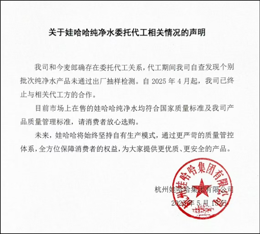 對於代工,娃哈哈的解釋是“去年產能不足”,今年4月已經終止與今麥郎的合作,理由是自檢過程發現“個別批次純淨水未通過抽樣檢測”。