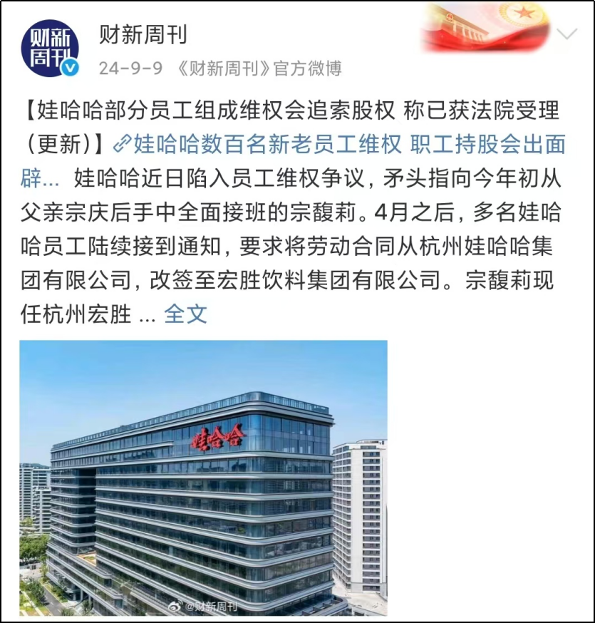 據媒體報道,去年8月以來,娃哈哈集團員工陸續被要求終止合同,轉而與宗馥莉控股的宏勝飲料集團簽訂合約,這或將影響員工此前享有的“乾股分紅”待遇,導致一些員工發起了面向娃哈哈的集體訴訟。