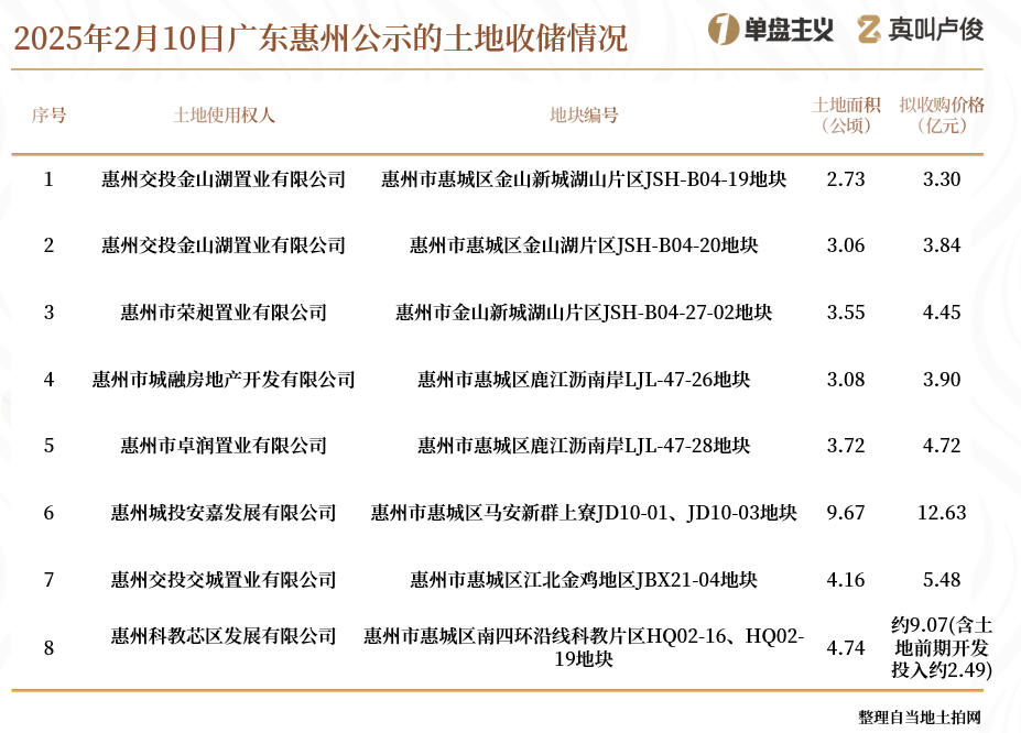 以廣東惠州為例,當地自然資源局在2月公示的一批擬收購的國有建設用地土地使用權明細
