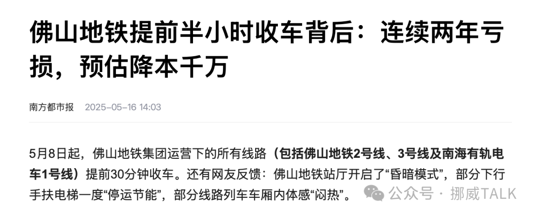 比如佛山地鐵開始提前收工了,並且降低照明,估計車廂空調製冷也降低了,都是為了降低成本。