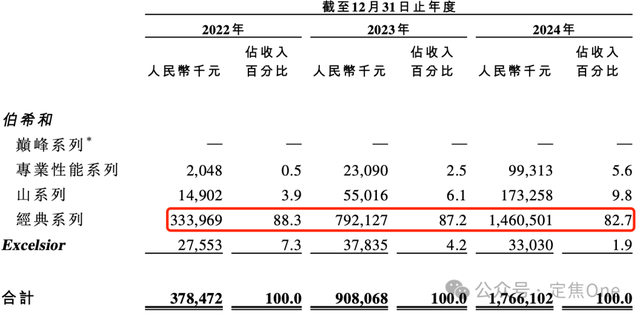 伯希和最早走的是大單品路線,最出圈、銷量最高的是品類是衝鋒衣,其中2012年推出的經典系列在2022年到2024年,連續三年收入佔比超過80%。