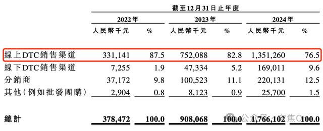 根據招股書,伯希和線上DTC銷售渠道在2022年-2024年佔比分別為87.5%、82.8%和76.5%,蕉下的線上DTC銷售渠道(線上店鋪+電商平台)佔比在2019年-2022年上半年也都持續超過七成。