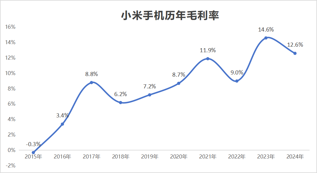 手機業務由於小米具有先發優勢,依託規模能夠壓降產業鏈成本。近年來,小米手機毛利率艱難“爬升”,但從未超過15%。