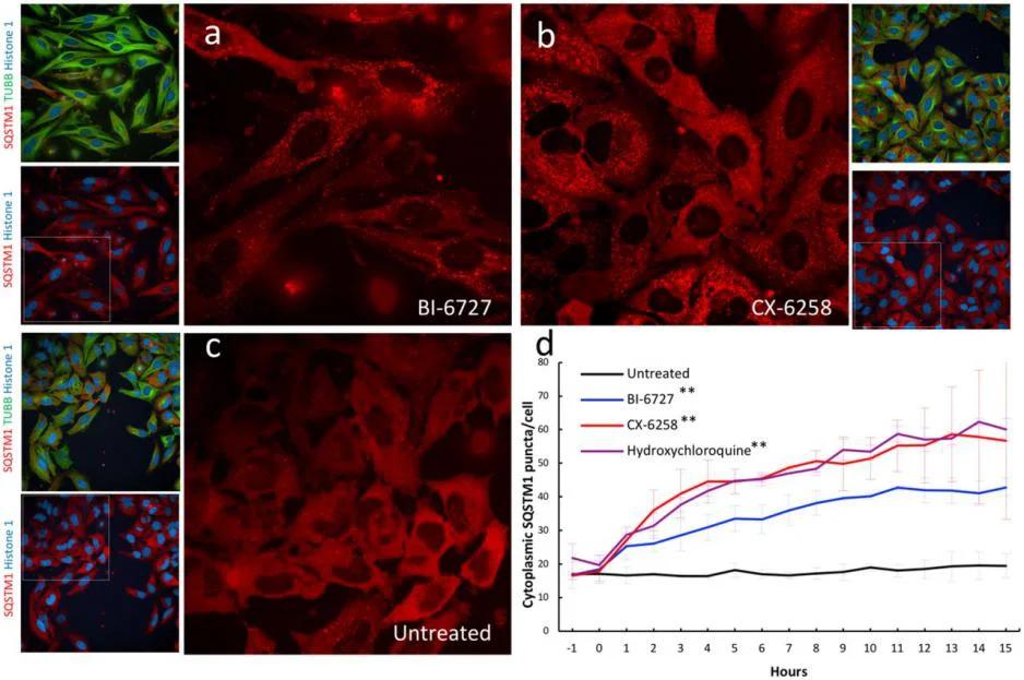 圖3: 三重標記的HELA細胞系中誘導自噬囊泡積累的激酶抑制劑的驗證