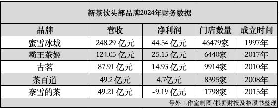 在已經上市的新茶飲品牌中,霸王茶姬2024年的營收達124.05億元、淨利潤達25.15億元,僅次於蜜雪冰城,遠超古茗、茶百道和奈雪的茶。尤為值得注意的是,霸王茶姬僅用不到蜜雪冰城15%的門店數量,就實現了其一半的營收和利潤。