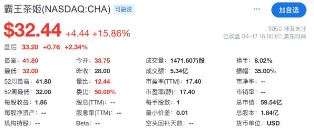 美東時間4月17日,霸王茶姬正式在美股掛牌上市,發行價為28美元, 開盤價33.75美元,開盤漲超20.53%,首日收漲15%,報32.44美元,市值達59.54億美元。