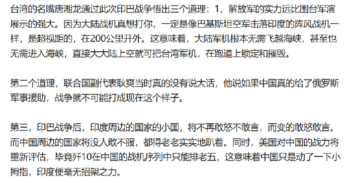 3. 本來大陸各種先進武器展示就有不小的衝擊。但都比不上印巴空戰離譜的結果,可以説台灣輿論已經決定性地逆轉了,流行的扯談節目中氣氛明顯不一樣了。內心支持投降的一方振振有詞,如唐湘龍等人展示了不錯的軍事認知,賣力宣傳“大陸軍事實力被低估其實極強”,對立輿論找不到説法。以前很多人實際是支持投降的,但説起來不太理直氣壯,對方會説美國武器厲害,守住就有辦法,等美援,扯不清。現在應該是沒得爭了。