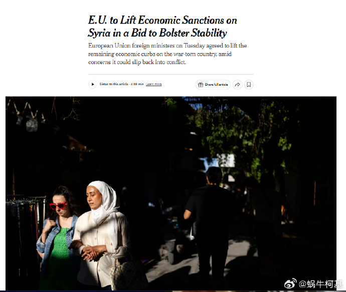 在特朗普接見豬豬,宣佈將解除對敍利亞的所有制裁後,歐盟週二也宣佈解除對敍利亞的所有經濟制裁,號稱是為了加強敍利亞的穩定,防止敍利亞再次陷入衝突之中。