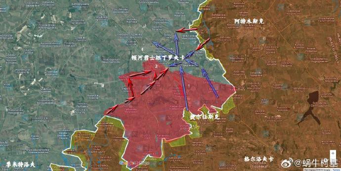 由於奧切列季涅之草二度生長(第一次是向西直達紅軍村南和庫拉霍沃),接下來無論是捷爾任斯克獲得突破(圖1)還是恰索夫亞爾獲得突破(圖2),頓河君士坦丁羅夫卡都要丟