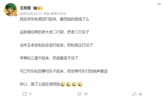 有博主稱其實京東和美團打起來,最危險的是餓了麼,這就是經典的老大老二打架,把老三打沒了。