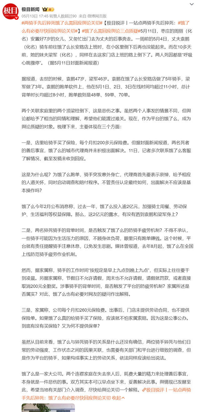 對於該事件,極目新聞發表了【極目鋭評丨一站點兩騎手先後猝死:#餓了麼有必要儘快回應輿論關切#】,表示餓了麼需要回應輿論三點質疑。