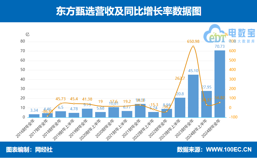 2024財年,東方甄選總營收約70.73億元,同比增長56.82%,報告期間,東方甄選抖音已付訂單總數達1.811億單。自營產品及直播電商業務總營收達65億元,同比增長68.1%。