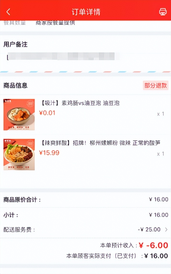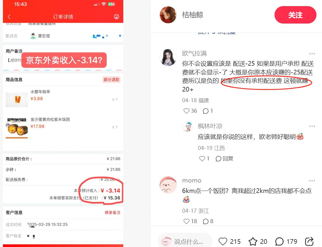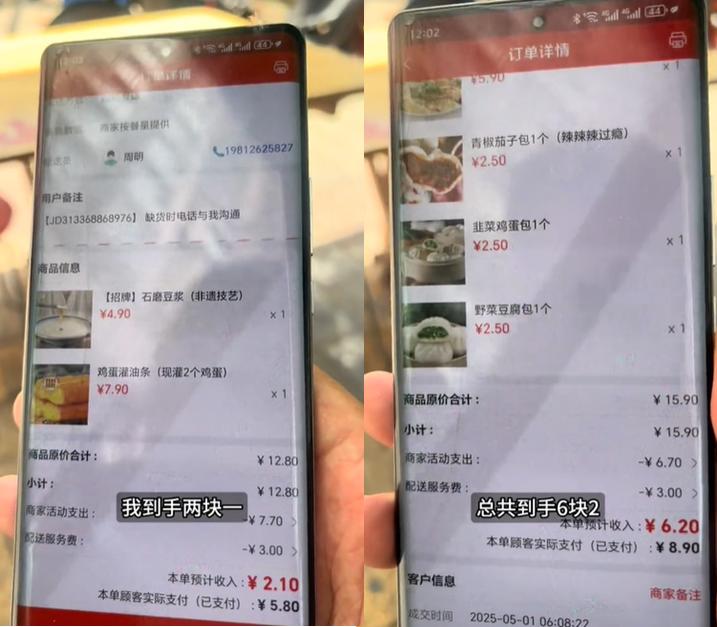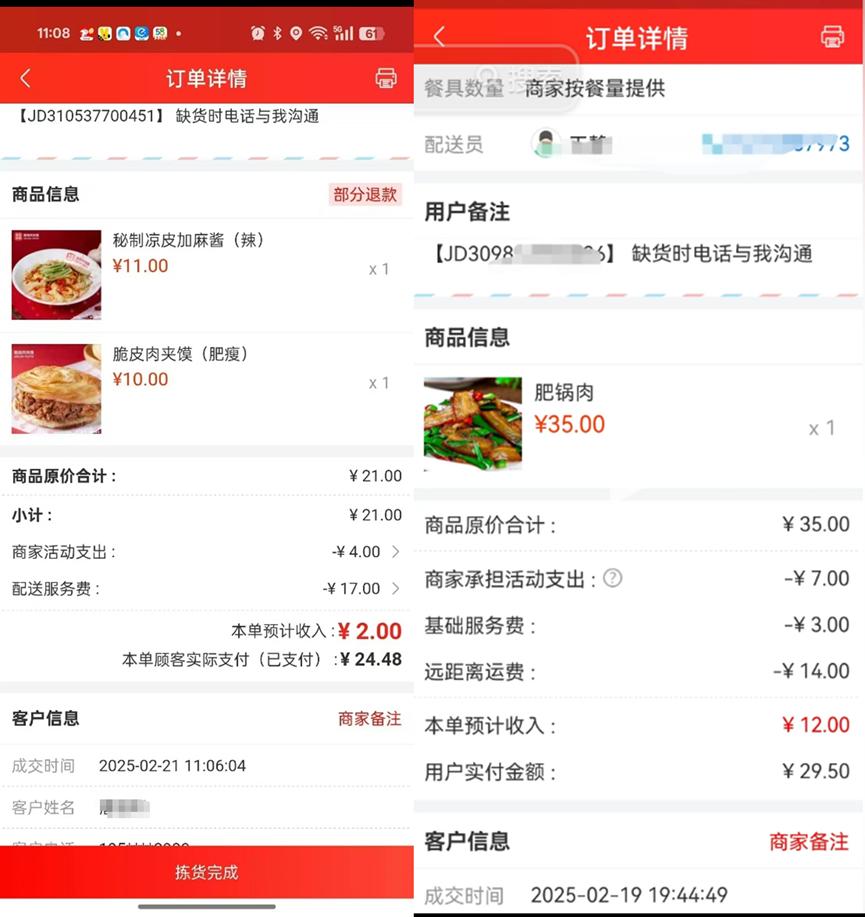 如下圖中,同一京東商家的兩筆訂單,看似到手收入跟顧客實際支付沒有太大差距,但是卻難以覆蓋商家出餐的成本。
