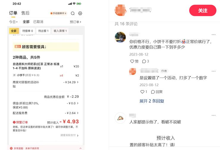 但需要注意的是,在各種複雜的活動面前,商家也應量力而行,根據店鋪的實際流量和單價制定具體的滿減、補貼方案,不然就會遇到上述訂單的問題。事實上,即便許多人認為,做餐飲行業是件低門檻的事,但在競爭愈發激烈的今天,在線上平台,也需要每一個商家學會使用營銷促銷工具,不然可能就會不小心賠本。