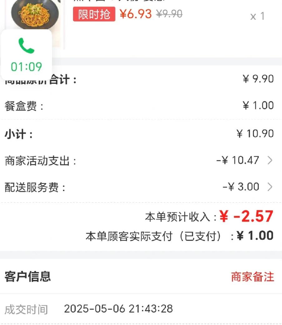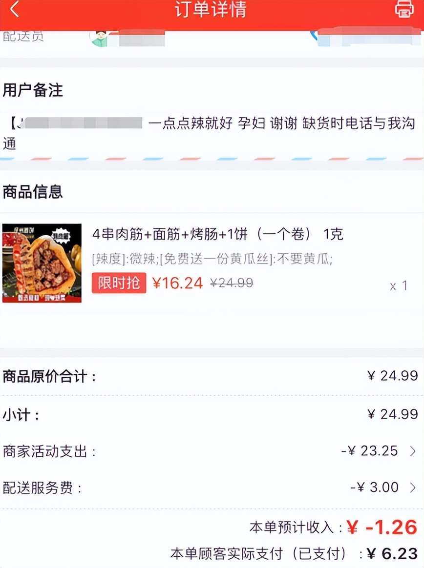 仔細觀察訂單,其配送服務費僅為3元,但商家活動支出卻佔了大頭。
