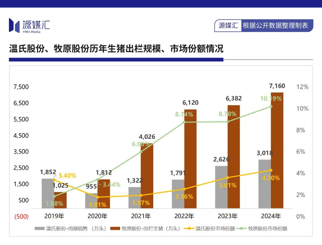 牧原股份“豬王”寶座越坐越穩,2024年市場份額為10.2%,較上年同期提升了1.41個百分點;温氏股份同期市場份額為4.3%,較上年提升了0.68%,想要超越對方變得越來越難。